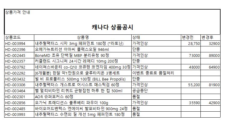 캐나다 상품 공지 페이지 정보 작성자 나누리솔루션 댓글 0건 조회 1,432회 작성일 24-11-14 08:45 본문 품절 및 가격 변동에 대해 안내드립니다. 판매에 참조하시길 바랍니다. 목록 답변 이전글상품 안내 20241115 24.11.15 다음글오아시스 상품가격공지 24.11.01 댓글목록 댓글목록 등록된 댓글이 없습니다.